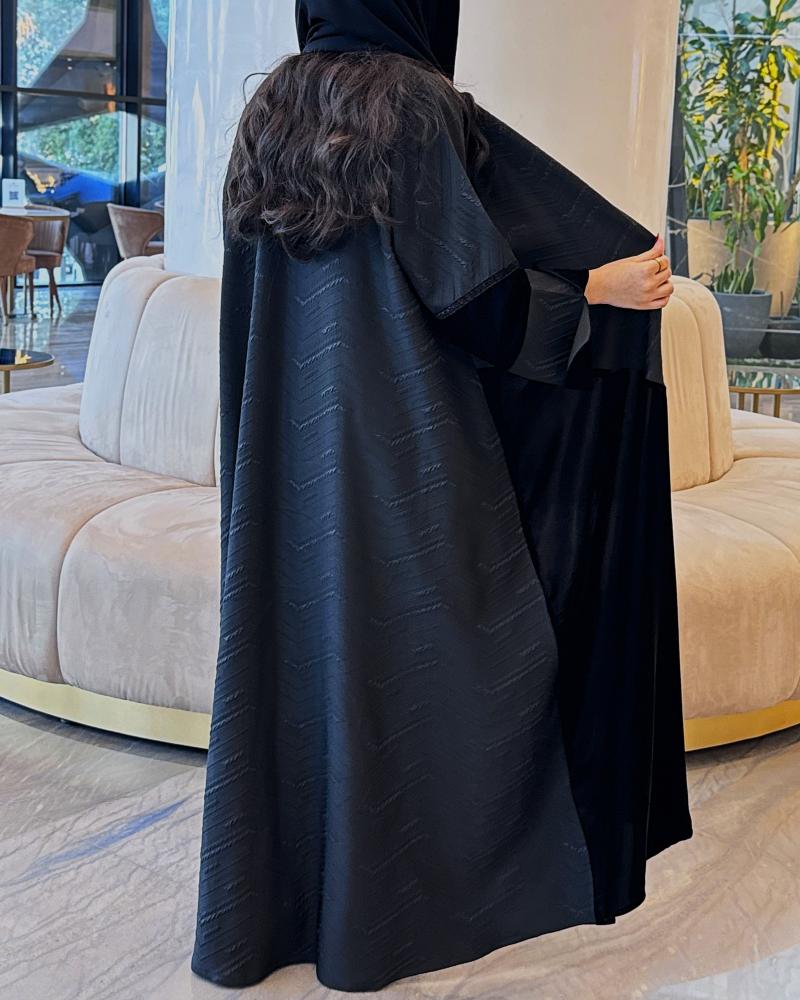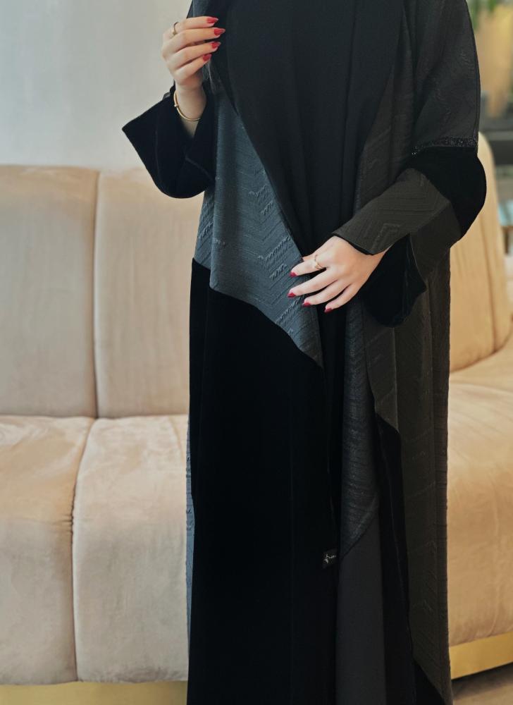 عباية تفته اسود قماشها ينسدل بلطف ويظهر نقشات بارزة تعطي مظهر لافت وملمس مميز.